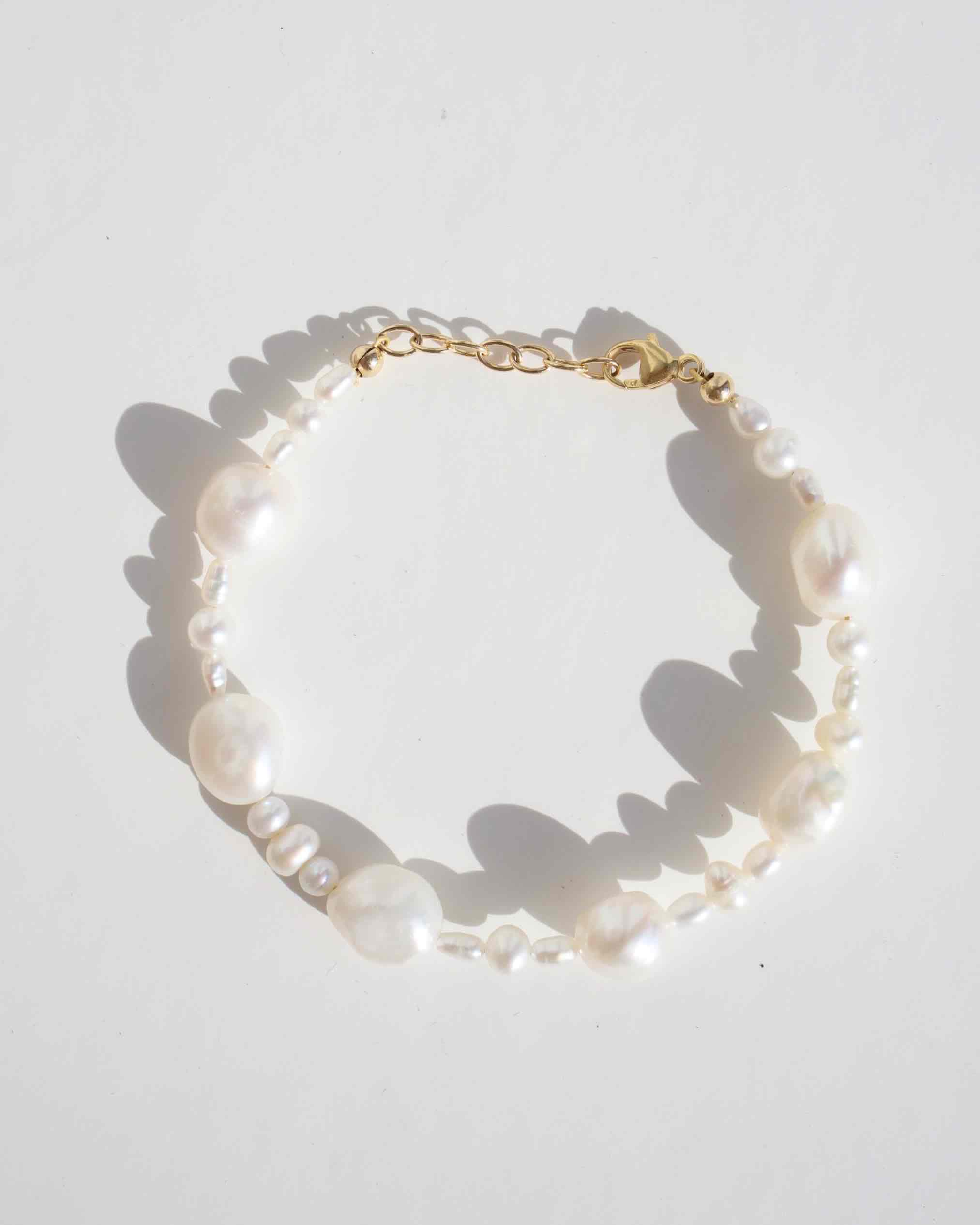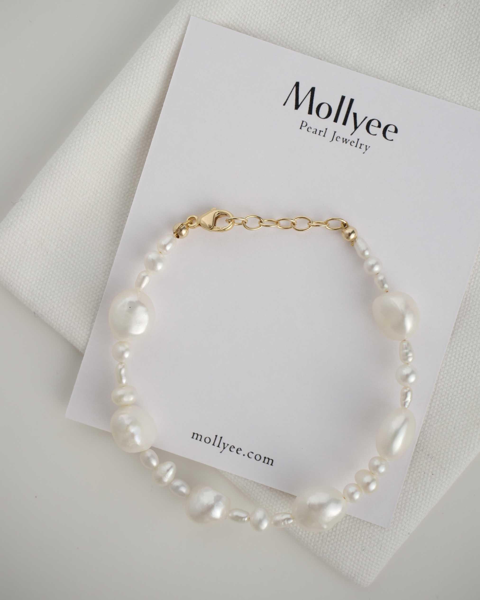 It features baroque freshwater pearls in alternating sizes, creating a charming, haphazard yet harmonious look. Crafted with 14K Gold Filled elements, it’s both stylish and durable. Super versatile for the young at heart, stack it up to express your individuality.