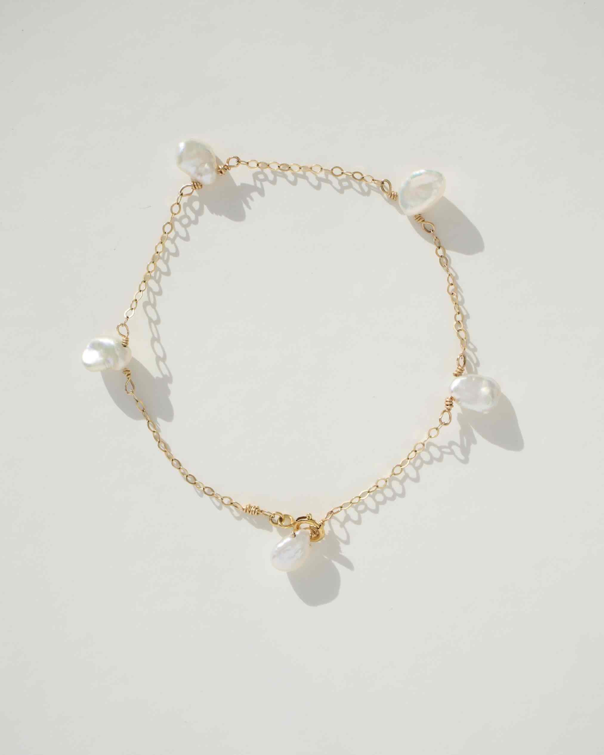 It masterfully combines uniquely – shaped petal – like baroque freshwater pearls with a glistening chain. Each pearl, with its distinct form, resembles a delicate flower petal, creating the illusion of a simple yet charming wreath around your wrist.